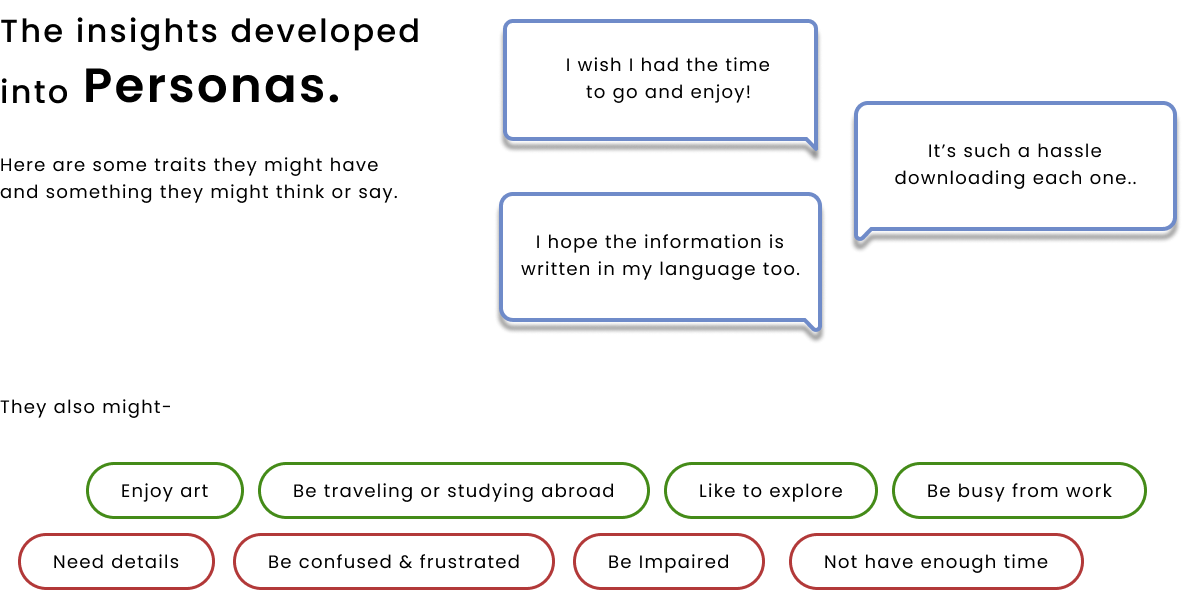 To understand the problem space, I ran a competitive audit of three major museum apps — Walt Disney Family Museum, Art Institute of Chicago, and St. Louis Public Library — and conducted interviews with 5 participants aged 19–60, who shared their experiences with art galleries and audio tours.